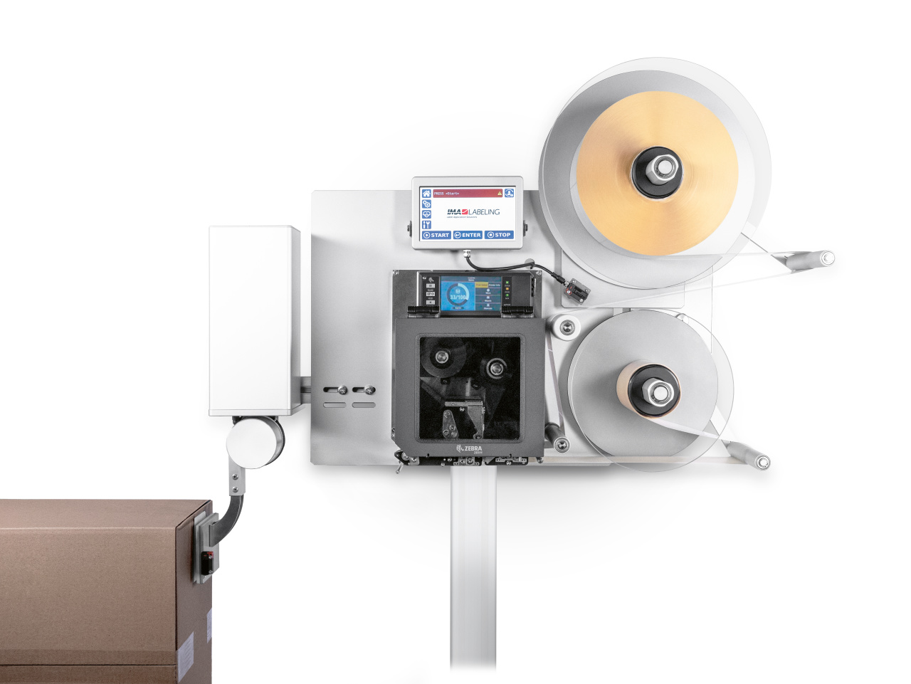 A real time print and apply label applicator system for corner-wrap applications, typically used for secondary packaging and perfect for pharmaceutical aggregation processes.It consists of two electric applicators, moving in synchronous thanks to the powerful electronic.